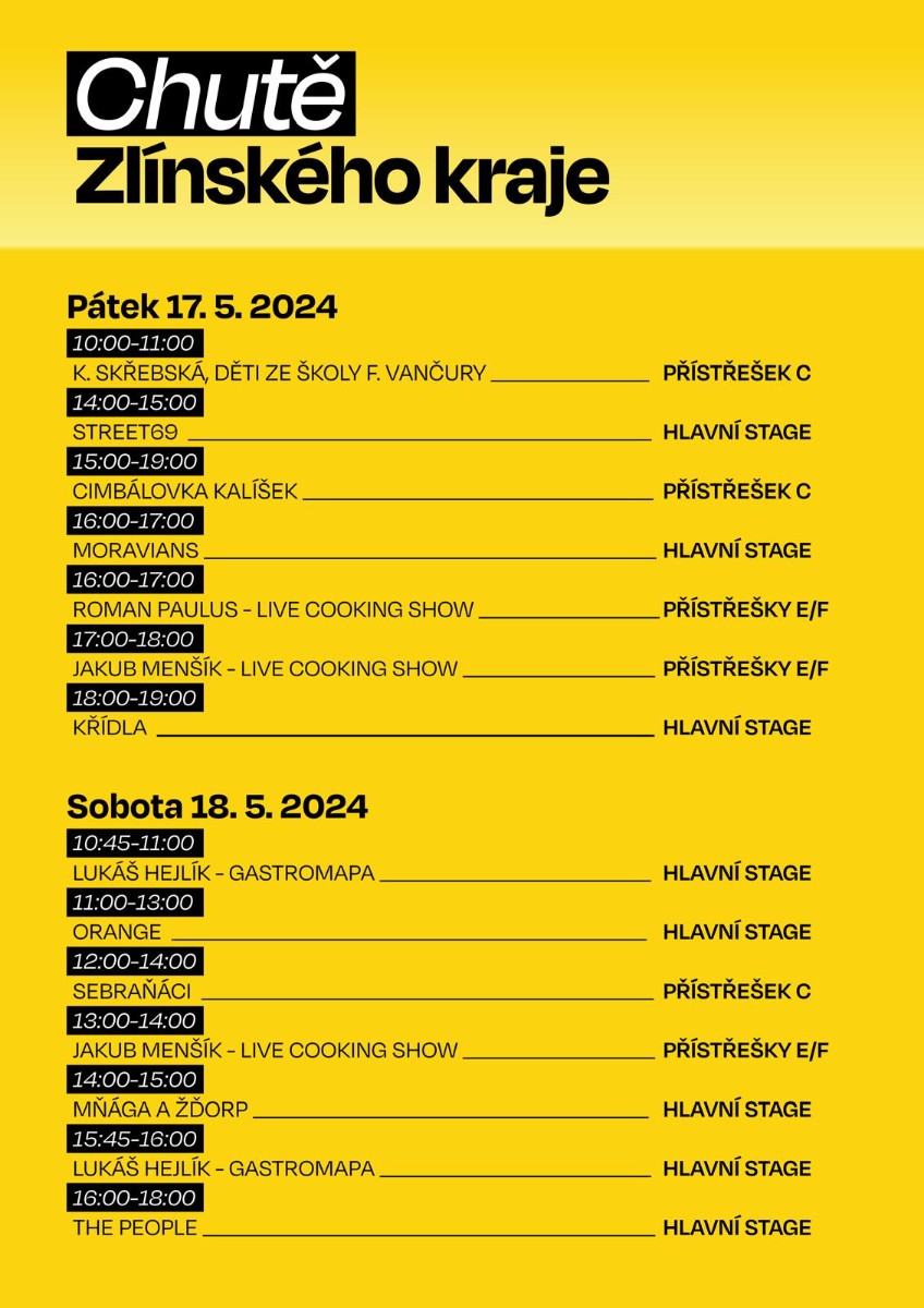 Doprovodný program festivalu bude skutečně pestrý a své kulinářské speciality naservírují při Live Cooking Show šéfkuchař Roman Paulus nebo účastník soutěže MasterChef Jakub Menšík. Čekají vás zajímavé rozhovory s autorkou kuchařek Markétou Hrubešovou či tvůrcem Gastromapy Lukášem Hejlíkem. Prostor dostanou i talentovaní kuchaři během soutěže Mistrovství Zlínského kraje ve vaření středních škol.